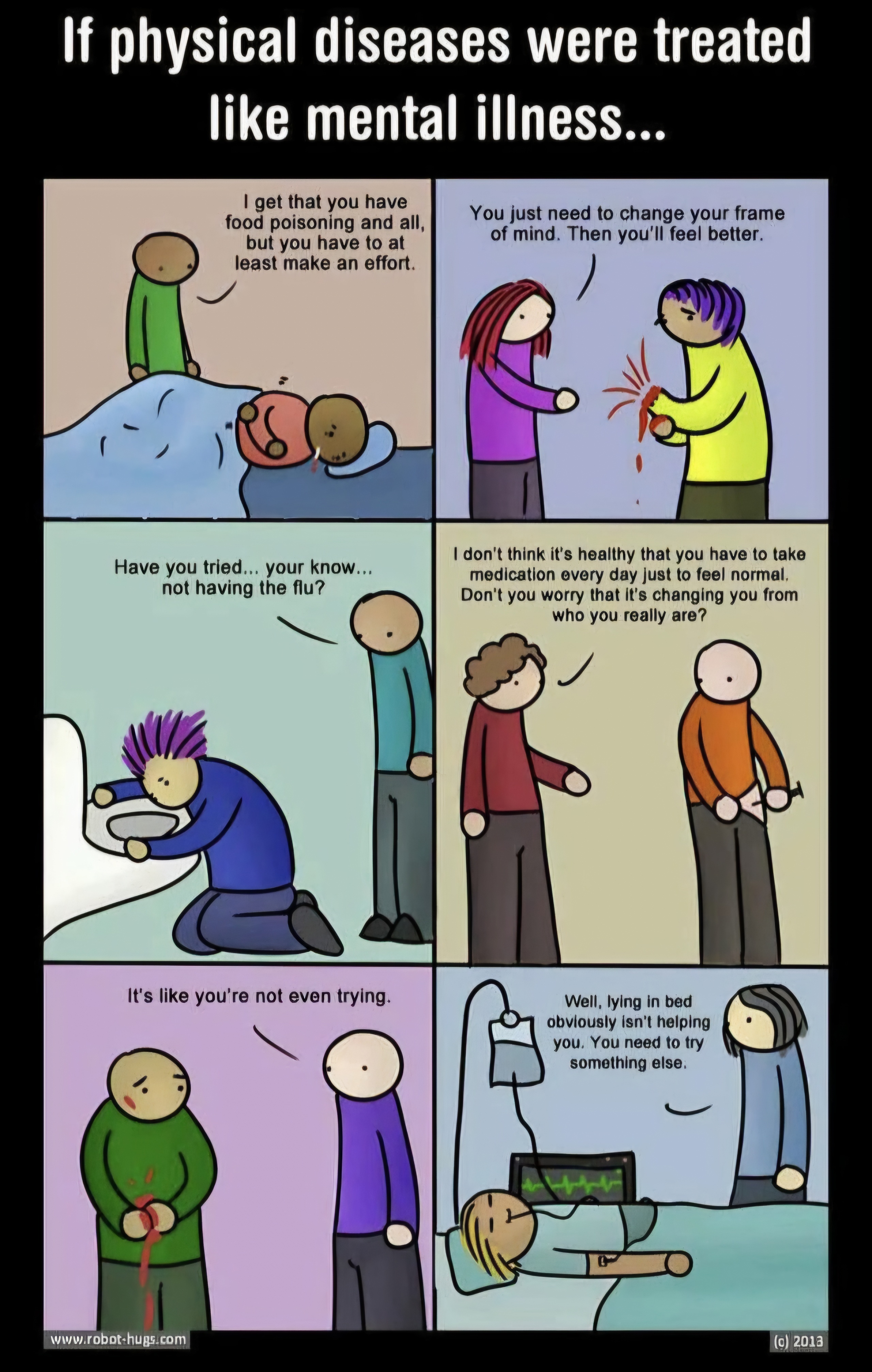 It’s not comparable. Whenever I see these posts, it always feels as if the author is suggesting that mental illness is just like a flu, you just get it accidentally and can’t help it and you just need to rest to get over it.