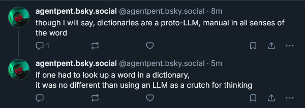 You know, I think that even the brick comparison still favors the traditional dictionary. After all, if you wanted to use it for traditional brick purposes like holding doors, weighing down papers, or throwing at [redacted], you would need to invest in a bunch of GPUS and burn them out generating a bunch of worthless slop, spending God only knows how much water, energy, and time. I want to save the rainforest as much as the next guy, but I think it’s obvious that the paper brick is far more cost-effective for both the user and the environment. And provided you can clean the dirt and blood off afterwards, you can even still use it as a dictionary.