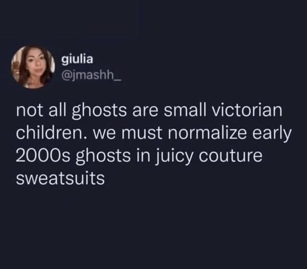 How come it’s always some pale-ass Victorian era ghost? Where’s all the ghosts of kids who died doing tiktok challenges? Wake up at the witching hour hearing a disembodied voice be like
