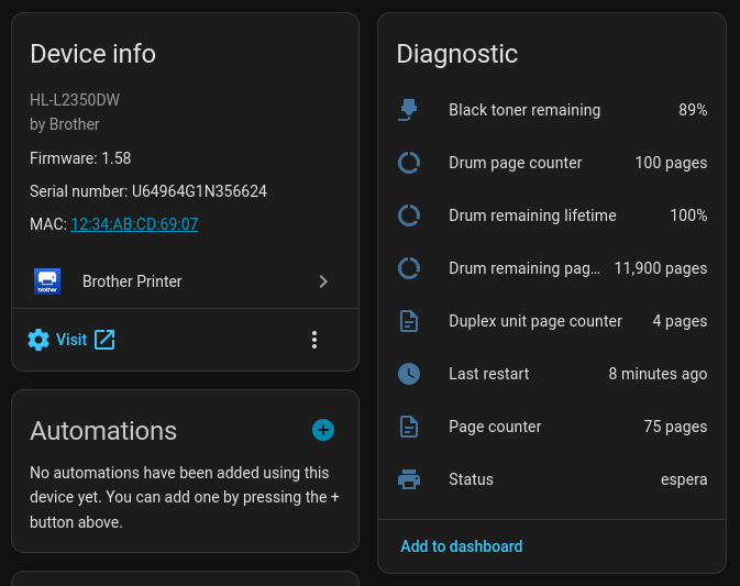 I bought a Brother laser printer (all in one). HomeAssistant immediately detected it and asked if I wanted to install the integration. All diagnostics were available immediately, and aside from some Wi-Fi issues (not the printer’s fault), everything worked perfectly.