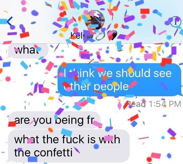 iOS automatically detects certain key words/phrases, and does animations. Or you can just hold down the Send button to trigger it (and a variety of other effects) manually. This person went out of their way to intentionally trigger the confetti with the “I think we should see other people” message, by holding Send and then selecting the confetti option.
