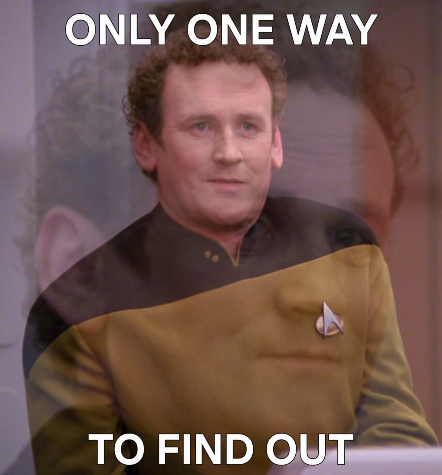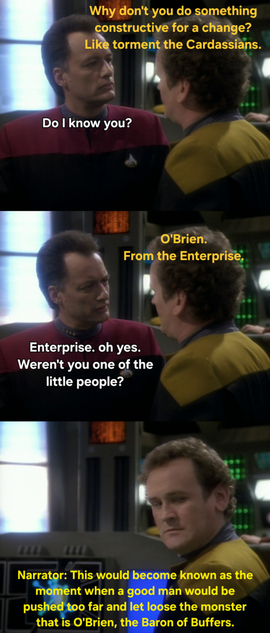 Is O’Brien going to beam up a Q, store his powers in the buffer, then finishing beaming his leftover mortal coil to the holodeck with no safety protocols to fight to the death against Worf’s Skeletor? I want to say yes.