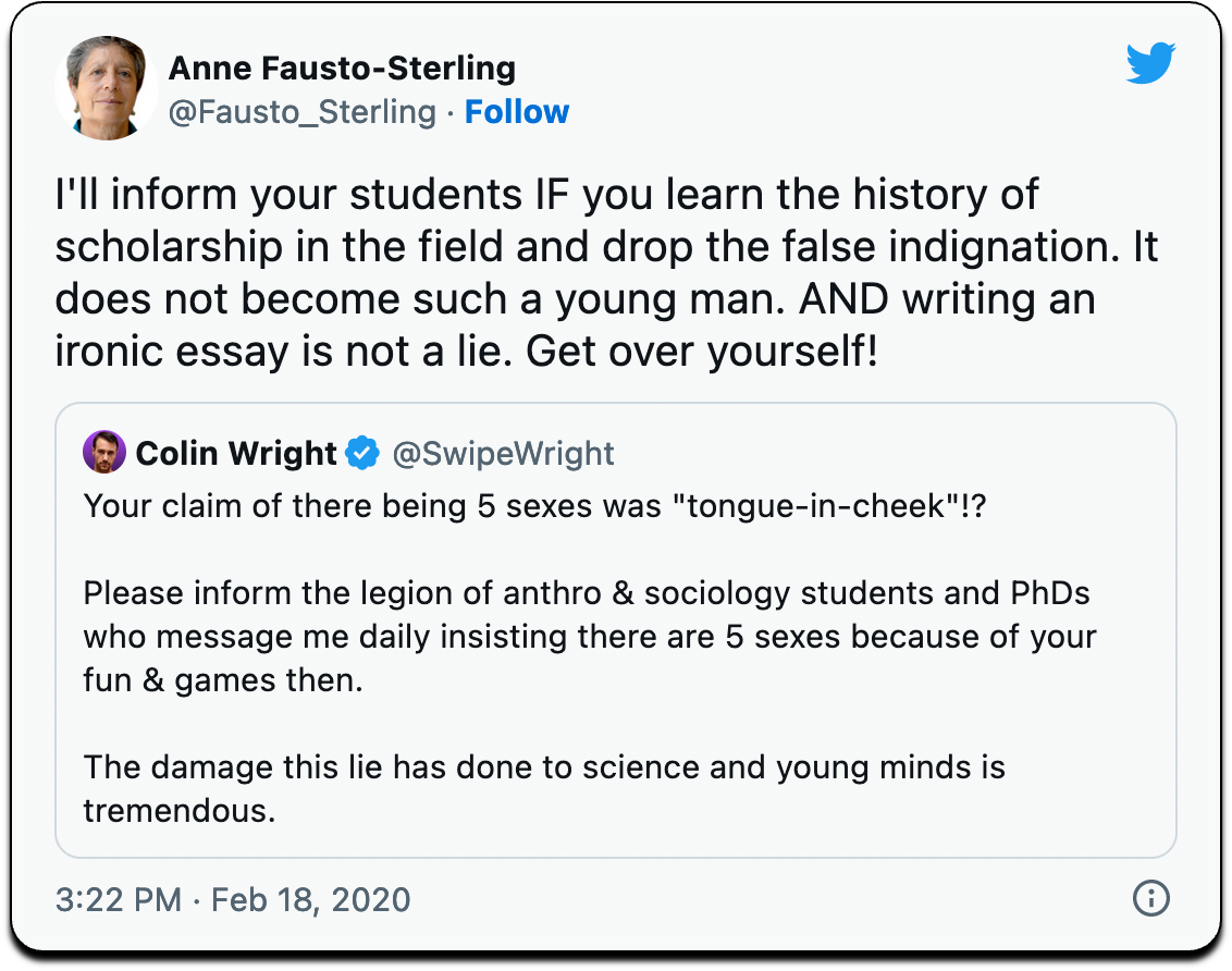 People really need to know when their worldview is based on falsehoods, and this is one of those times. As an example, you might have heard of the concept of “5 sexes”, but it turns out that the source of that claim was someone who certainly knows better being “tongue-in-cheek” and “ironic”: