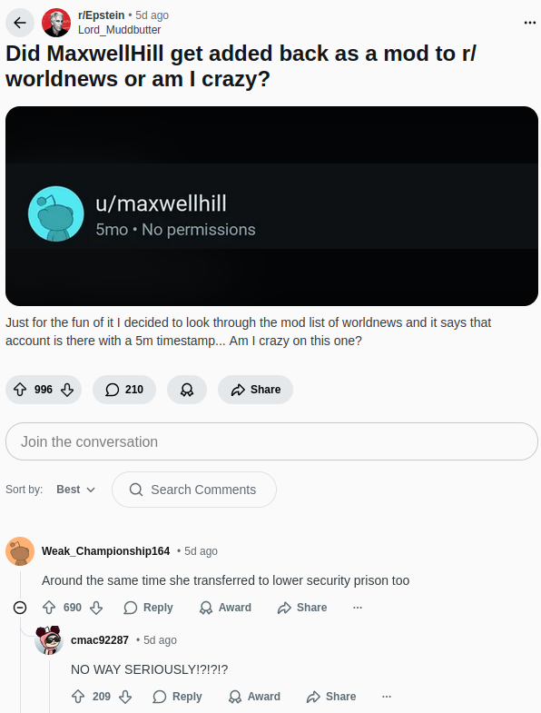Indeed all very odd. Most odd of all r/worldnews adding the account back as moderator when Maxwell got released from the top security prison, despite knowing about the conspiracy.